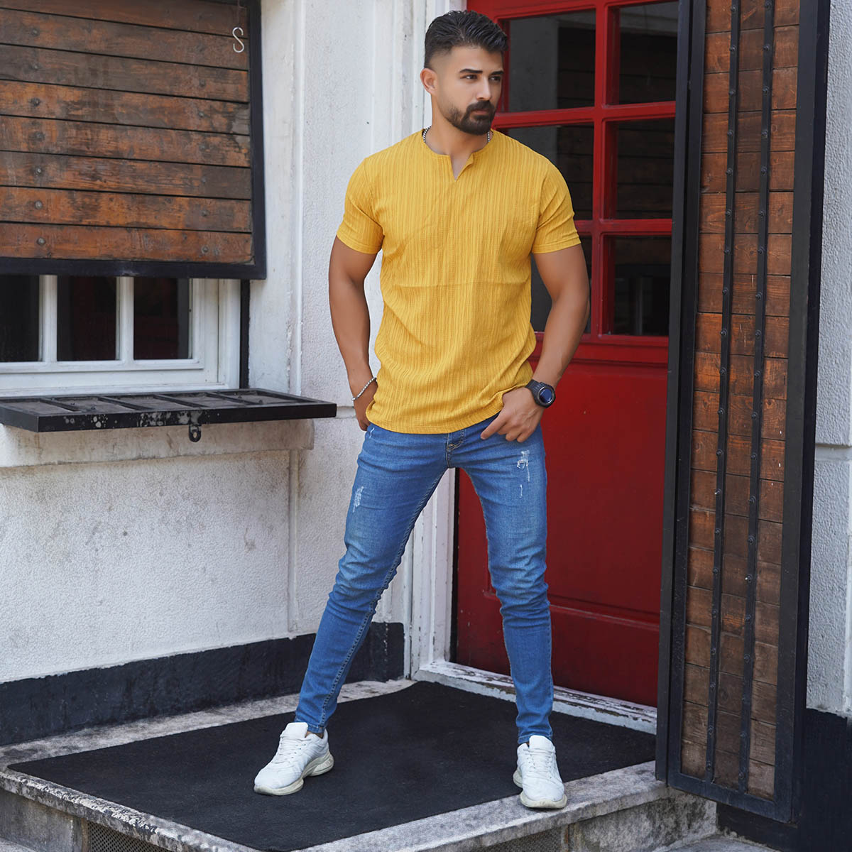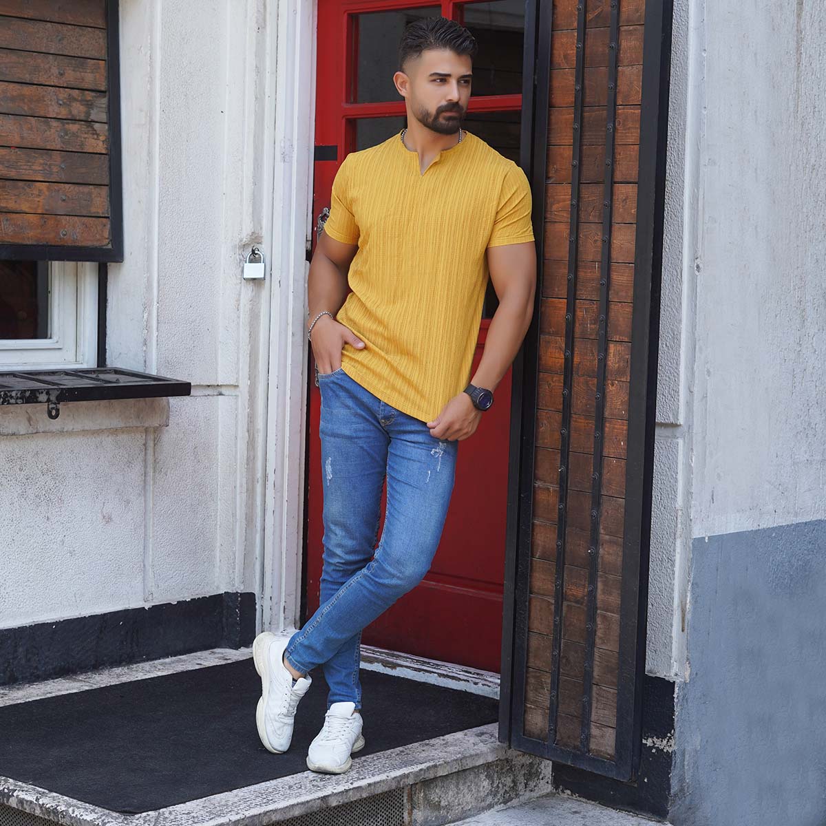 تیشرت آستین کوتاه خردلی مردانه مدل Bardia